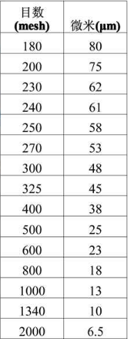 水性铝粉浆的一般粒径范围在6um到80um之间。客户需求主要集中在6um-40um 之间, 一般 20um 以下为细粉,20um 以上为粗粉,根据客户所需粒径进行样品提供。另外,有些客户会按照目数进行划分,这就需要我们根据目数进行转化。粒径目数转化表如下: